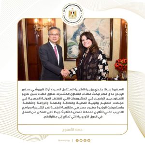 7) السفيرة سها جندي وزيرة الهجرة تستقبل السيد/ أوكا هيروشي، سفير اليابان لدى مصر لبحث ملفات التعاون المشترك، تناول اللقاء سبل تعزيز التعاون بين البلدين في المشروعات التي تنفذها الدولة المصرية في مجالات التعليم والبنية التحتية والطاقة والصحة والزراعة والثقافة، واستعرضت الوزيرة جهود مصر في مكافحة الهجرة غير الشرعية وبرامج التدريب الفني لتأهيل العمالة المصرية تأهيلًا جيدًا حتى تتمكن من العمل في الدول الأوروبية التي تحتاج إلى مهاراتهم.