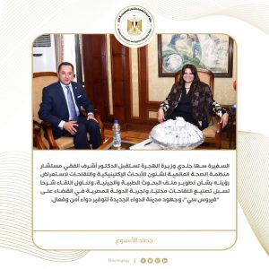 9) السفيرة سها جندي وزيرة الهجرة تستقبل الدكتور أشرف الفقي مستشار منظمة الصحة العالمية لشئون الأبحاث الإكلينيكية واللقاحات لاستعراض رؤيته بشأن تطوير ملف البحوث الطبية والجينية، وتناول اللقاء شرحا لسبل تصنيع اللقاحات محليًا، وتجربة الدولة المصرية في القضاء على "فيروس سي"، وجهود مدينة الدواء الجديدة لتوفير دواء آمن وفعال.