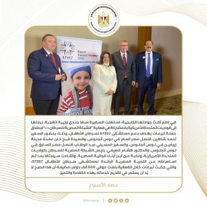 3) في إطار ثالث جولاتها الخارجية، استهلت السفيرة سها جندي وزيرة الهجرة، زيارتها إلى الولايات المتحدة الأمريكية بالمشاركة في فعالية "الشبكة المصرية للسرطان ECN" لإطلاق حملة تبرعات بهدف دعم مستشفى 57357 لسرطان الأطفال، وذلك بحضور السفير أحمد شاهين، قنصل مصر العام في لوس أنجلوس، والسيدة فرح خان عمدة مدينة إيرفين في لوس أنجلوس، والسفير الحسيني عبد الوهاب قنصل مصر السابق في لوس أنجلوس، والدكتور هشام الصيفي، رئيس الشبكة المصرية للسرطان بالولايات المتحدة الأمريكية، ونخبة من أبرز أبناء الجالية المصرية، وأشادت سيادتها بما تم استعراضه عن التجربة المصرية الرائدة لمستشفى سرطان الأطفال 57357، والتي جذبت تبرعات خلال الفعالية بلغت حوالي 600 ألف دولار، مضيفة أن هذا الصرح لا بُد أن يستمر في تقديم خدماته بهذه الكفاءة والتميز.