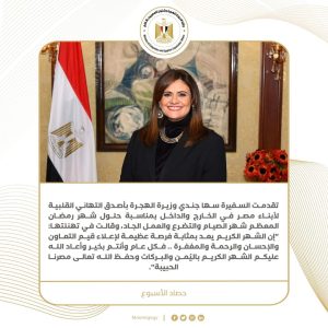 11) تقدمت السفيرة سها جندي وزيرة الهجرة بأصدق التهاني القلبية لأبناء مصر في الخارج والداخل بمناسبة حلول شهر رمضان المعظم شهر الصيام والتضرع والعمل الجاد، وقالت في تهنئتها: "إن الشهر الكريم يعد بمثابة فرصة عظيمة لإعلاء قيم التعاون والإحسان والرحمة والمغفرة .. فكل عام وأنتم بخير وأعاد الله عليكم الشهر الكريم باليُمن والبركات وحفظ الله تعالى مصرنا الحبيبة".