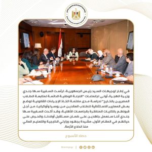 1) في إطار توجيهات السيد رئيس الجمهورية، ترأست السفيرة سها جندي وزيرة الهجرة، أولى اجتماعات "اللجنة الوطنية الدائمة لمتابعة الطلاب المصريين بالخارج" لدراسة مدى ملائمة اتخاذ الإجراءات القانونية لوضع بعض المعايير الاستثنائية للطلاب العائدين من روسيا وأوكرانيا، من أجل قبولهم بالكليات المناظرة بالجامعات الأهلية، وقد أكدت السفيرة سها جندي أننا سنعمل جاهدين على ضمان مستقبل أولادنا، والحرص على حياتهم في المقام الأول، مشيدة بجهود وزارتي الخارجية والتعليم العالي منذ اندلاع الأزمة.