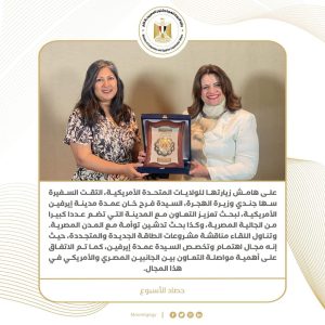 4) على هامش زيارتها للولايات المتحدة الأمريكية، التقت السفيرة سها جندي وزيرة الهجرة، السيدة فرح خان عمدة مدينة إيرفين الأمريكية، لبحث تعزيز التعاون مع المدينة التي تضم عددا كبيرا من الجالية المصرية، وكذا بحث تدشين توأمة مع المدن المصرية. وتناول اللقاء مناقشة مشروعات الطاقة الجديدة والمتجددة، حيث إنه مجال اهتمام وتخصص السيدة عمدة إيرفين، كما تم الاتفاق على أهمية مواصلة التعاون بين الجانبين المصري والأمريكي في هذا المجال.