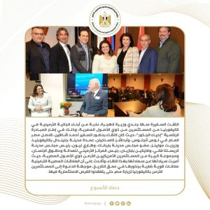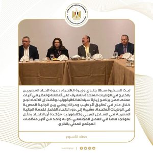 8) لبت السفيرة سها جندي وزيرة الهجرة، دعوة اتحاد المصريين بالخارج في الولايات المتحدة، للتعرف على أعضائه والنظر في آليات عمله، ضمن برنامج زيارة سيادتها لكاليفورنيا، وقالت إن الاتحاد نجح خلال عام في تحقيق أثر طيب وحراك إيجابي بين الجالية المصرية في الولايات المتحدة، مشيرة إلى دور الاتحاد الفاعل لخدمة الجالية المصرية في الساحل الغربي وكاليفورنيا، مؤكدة أن الاتحاد يمثل نموذجا هاما في العمل المجتمعي، كونه واحد من أكبر منظمات المجتمع المدني بالخارج.