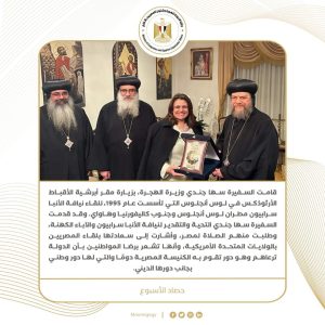 7) قامت السفيرة سها جندي وزيرة الهجرة، بزيارة مقر أبرشية الأقباط الأرثوذكس في لوس أنجلوس التي تأسست عام 1995، للقاء نيافة الأنبا سرابيون مطران لوس أنجلوس وجنوب كاليفورنيا وهاواي. وقد قدمت السفيرة سها جندي التحية والتقدير لنيافة الأنبا سرابيون والآباء الكهنة، وطلبت منهم الصلاة لمصر، وأشارت إلى سعادتها بلقاء المصريين بالولايات المتحدة الأمريكية، وأنها تشعر برضا المواطنين بأن الدولة ترعاهم وهو دور تقوم به الكنيسة المصرية دومًا والتي لها دور وطني بجانب دورها الديني.