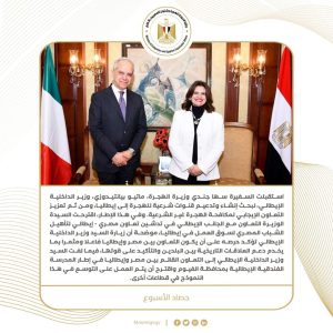 2) استقبلت السفيرة سها جندي وزيرة الهجرة، ماتيو بيانتيدوزي، وزير الداخلية الإيطالي، لبحث إنشاء وتدعيم قنوات شرعية للهجرة إلى إيطاليا، ومن ثم تعزيز التعاون الإيجابي لمكافحة الهجرة غير الشرعية. وفي هذا الإطار، اقترحت السيدة الوزيرة التعاون مع الجانب الإيطالي في تدشين تعاون مصري - إيطالي لتأهيل الشباب المصري لسوق العمل في إيطاليا، موضحة أن زيارة السيد وزير الداخلية الإيطالي تؤكد حرصه على أن يكون التعاون بين مصر وإيطاليا فاعلا ومثمرا بما يخدم دعم العلاقات التاريخية بين البلدين والتأكيد على قوتها، فيما لفت السيد وزير الداخلية الإيطالي إلى التعاون القائم بين مصر وإيطاليا في إطار المدرسة الفندقية الإيطالية بمحافظة الفيوم واقترح أن يتم العمل على التوسع في هذا النموذج في قطاعات أخرى.
