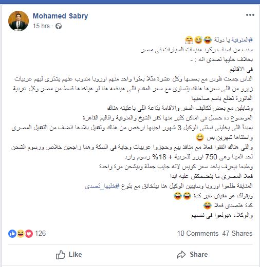 وأضاف: "مجموعة المشترين شايلين مع بعض تكاليف السفر والإقامة بتاعه اللى باعتينه هناك، الموضوع ده حصل فى أماكن كتير منها كفر الشيخ والمنوفية وأقاليم القاهرة، بمبدأ اللى يخلينى استنى الوكيل 3 أشهر أجيبها أرخص من هناك وتقفيل بلادها أنضف من التقفيل المصرى واستناها شهرين بس، واللى هناك اتفقوا فعلًا مع منافذ بيع وحجزوا عربيات وجايه فى السكة وهما راجعين خلاص ورسوم الشحن لحد المينا وهى 750 يورو للعربية + 18% رسوم وارد، وطبعا بيعرف ياخد سعر كويس لأنه جايب جملة وبيشحن مرة واحدة"، واختتم تدوينته "فعلًا المصرى ما ينضحكش عليه أبدًا، المنايفة طلعوا أوروبا وسايبين الوكيل هنا بيتخانق مع بتوع خليها تصدى، ويقولك هو مفيش غير كده.. كدة هتصدى فعلا والوكلاء هيولعوا فى نفسهم".