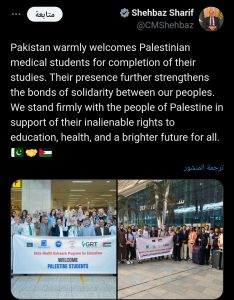 وأعرب في التغريدة بقوله "ترحب باكستان ترحيبا حارا بطلاب الطب الفلسطينيين لإكمال دراستهم. إن وجودهم يعزز روابط التضامن بين شعبينا. ونحن نقف بحزم إلى جانب الشعب الفلسطيني في دعم حقوقه الطبيعية في التعليم والصحة ومستقبل أكثر إشراقا للجميع"