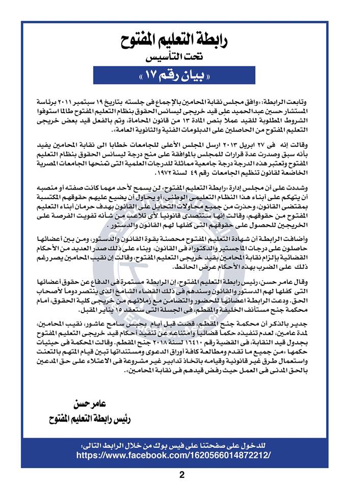 وأضاف ، رئيس رابطة التعليم المفتوح، إن الرابطة مستمرة فى الدفاع عن حقوق أعضائها التى كفلها لهم الدستور والقانون وسندهم فى ذلك القضاء الشامخ الذى ينتصر دوماً لأصحاب الحق. ودعت الرابطة اعضائها للحضور والتضامن مع زملائهم من خريجى كلية الحقوق، أمام محكمة جنح مستأنف الخليفة والمقطم، فى الجسلة التى ستعقد ١٥ يناير المقبل.