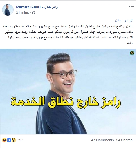 ويستعد "جلال" هذا الموسم، بتقديم برنامج المقالب الشهير به في رمضان بعنوان "رامز خارج نطاق الخدمة"، حيث يذهب بضيفه إلى العالم الآخر، ويُقدمه إلى الملكين للحساب في قبره.
