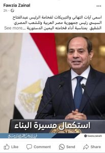 وتصدرت صورة فخامة الرئيس عبدالفتاح السيسي المنشور الذي كتبته سعادة السفيرة فوزية بنت عبد الله زينل تحت شعار "استكمال مسيرة البناء"، قائلة: أسمى آيات التهاني لفخامة الرئيس عبدالفتاح السيسي وللشعب المصري الشقيق، بمناسبة أداء اليمين الدستورية لولاية رئاسية جديدة.