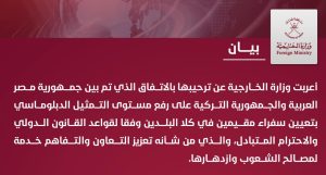 أعربت سلطنة عُمان اليوم في بيان لوزارة الخارجية عن ترحيبها بالاتفاق الذي تم بين جمهورية مصر العربية وجمهورية تركيا،على رفع مستوى التمثيل الدبلوماسي بتعيين سفراء مقيمين في كلا البلدين وفقًا لقواعد القانون الدولي والاحترام المتبادل؛ والذي من شأنه أن يعزز التعاون والتفاهم، خدمةً لمصالح الشعوب وازدهارها.