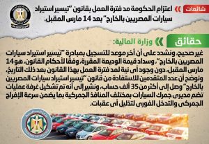 تداولت بعض المواقع الإلكترونية وصفحات التواصل الاجتماعي أنباء حول اعتزام الحكومة مد فترة العمل بقانون "تيسير استيراد سيارات المصريين بالخارج" بعد ١٤ مارس المقبل، وقد قام المركز الإعلامي لمجلس الوزراء بالتواصل مع وزارة المالية، والتي نفت تلك الأنباء، مُؤكدةً أنه لا صحة لمد فترة العمل بقانون "تيسير استيراد سيارات المصريين بالخارج" بعد ١٤ مارس المقبل، مُشددةً على أن أخر موعد للتسجيل بمبادرة "تيسير استيراد سيارات المصريين بالخارج"، وسداد قيمة الوديعة المقررة، وفقًا لأحكام القانون، هو ١٤ مارس المقبل، دون وجود أي نية لمد فترة العمل بهذا القانون بعد ذلك التاريخ، موضحةً أن عدد المتقدمين للاستفادة من قانون "تيسير سيارات المصريين بالخارج" وصل إلى أكثر من ٣٥ ألف حساب، مُشيرةً إلى أنه تم تشكيل غرفة عمليات تضم مديري جمرك السيارات بمختلف المنافذ الجمركية بما يضمن سرعة الإفراج الجمركي والتدخل الفوري لتذليل أي عقبات.