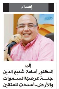 وتناول اللقاء سر الاهداء إلى الدكتور أسامة شفيع الدين الذي وافته المنية العام الماضي وهو بالمناسبة أستاذ الشريعة الإسلامية بكلية دار العلوم جامعة القاهرة ويعتبر الدكتور أسامة هو ابن الاستاذ الدكتور شفيع الدين السيد أستاذ النقد والبلاغة بدار العلوم وهو أستاذ للمؤلف حيث درس له أثناء دراسة المؤلف في الكلية فعرفانا باستاذيته كان إهداء حضور وانصراف إلى روح نجله الدكتور المغفور له بإذن الله أسامة .