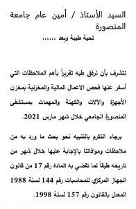 الكتابة هى تعبير عن اوجاع الوطن وتشخيص لحاله الداء الكامن بين جنباتة وان لم تكن كذلك فلا فائدة منها فى هذه المساحة سوف نواصل الكتابة عن اهدار المال العام النازف بين جنبات مستشفيات جامعة المنصورة تحت رئاسة المدعو الشعراوى موسى والذى يدفع ثمن ذلك هما مرضى السرطان الذى لم يرحمهم المرض ونهش لحمهم المذكور انفا والكتابة هنا ايضا نستمدها من تقرير الجهاز المركزى للمحاسبات وليس من اخترعنا حيث صدر التقرير فى مارس 2021 وقت رئاسة المذكور لمستشفى جامعة المنصورة حيث كان التقرير يتحدث عن الملاحظات التي أسفر عنها فحص الاعمال المالية والمخزنية بمخزن الأجهزة والآلات والكهنة والمهمات بمستشفى المنصورة الجامعي خلال شهر مارس 2021