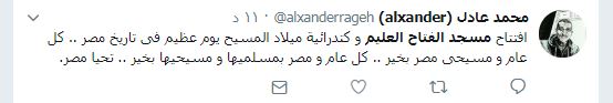 تنوعت التعليقات عبر الهاشتاجات، غرد محمد عادل، قائلاً :"افتتاح مسجد الفتاح العليم و كاتدرائية ميلاد المسيح يوم عظيم فى تاريخ مصر .. كل عام و مسيحى مصر بخير .. كل عام و مصر بمسلميها و مسيحيها بخير .. تحيا مصر"، وأضاف آخر:" كل سنة وكل أخواتنا وأهلنا المصريين طيبين بمناسبة عيد الميلاد المجيد ويارب تكون مصر أجمل وأحسن وإحنا مع بعض ونبنى مصر سوا".