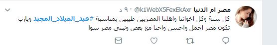 وغرد آخر:" كل سنه وكل الاخوة المسيحيين بخير وفى هنا وصحة وسعادة وأخواتنا دايما وأحبتنا ربنا يديمكو وربنا مايورينا حاجه وحشه فى بعض ايد واحده علطول يارب وهابي كريسمس لأخواتنا ربنا يديمها عليكو فرحه".