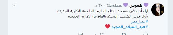 "مع أول أذان لمسجد الفتاح العليم وجرس بكاتدرائية ميلاد السيد المسيح، فى العاصمة الإدارية الجديدة، تبادل المصريين التهانى بحلول أعياد الميلاد المجيدة، عبر هاشتاجات تصدرت قائمة الأكثر تداولا على تويتر، " مسجد الفتاح العليم" و "عيد الميلاد المجيد" و "العاصمة الإدارية". تنوعت التع
