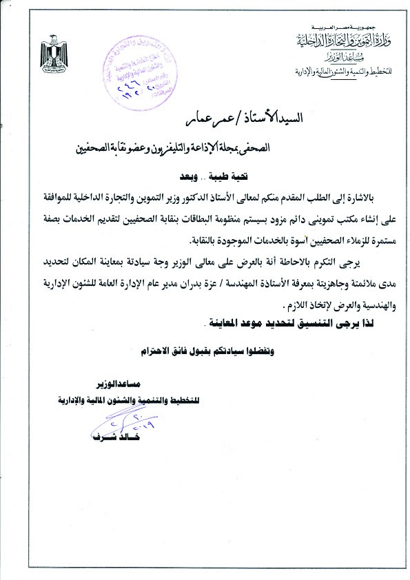 حصل الزميل عمر عمار الصحفي بمجلة الاذاعة والتليفزيون على موافقة الدكتور على المصيلحي وزير التموين والتجارة الداخلية بإنشاء مكتب تمويني دائم مزود بمنظومة البطاقات والتي تتضمن "استخراج بطاقة أول مرة بدل تالف _بدل فاقد _فصل اجتماعي تحديث بيانات_ نقل من محافظة لأخري _ وجميع الخدمات المتعلقة بهذا الشأن" بنقابة الصحفيين لتقديم الخدمات بصفة مستمرة ودائمة وذلك تيسيرا على الزملاء الصحفيين من الذهاب ألي مكاتب التموين أو مقر الوزارة.