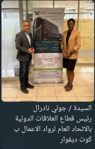 كما عقد د يسري الشرقاوي اجتماعا موسعا مع السيدة جولي نادرل رئيسة قطاع التعاون الدولي بالاتحاد العام لرواد الاعمال بكوت ديفوار والذي يضم ٢٨ اتحاد فرعي وتخصصي لرواد الاعمال في مختلف القطاعات وبه ٣٥٠٠ عضو ومعدل العائد السنوي لاستثمارات الاعضاء يبلغ ٢٧.٧ مليار يورو سنويا.، وتناول معها الاتفاق علي بروتوكول تعاون جاري اعداده،، يتم من خلاله. " استقبال بعثة تجارية منّ المشتريين من كوت ديفوار للقاهرة وكذا توحيد الجهود لنجاح منصة "فاتا" من أفريقيا لافريقيا ..والتي ستطلقها الجمعية خلال هذا العام.