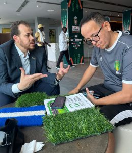 و تزامناً للرحلة مع اجواء بطولة امم افريقيا ٢٠٢٤ والتي تستضيفها العاصمة ابيدجان حرص رئيس الجمعية د الشرقاوي والوفد المرافق تحقيق اهداف لجنة الاستثمار الرياضي بالجمعية وتم في ذلك عقد عدد من اللقاءات مع رؤساء بعض الاتحادات المرافقين لبعثاتهم وكذا البعثات الاعلامية وذلك بهدف الترويج وابرام التعاقدات لمنتجات النجيل الصناعي و احتياجات الملاعب الرياضية وكذا الملابس الرياضية و عدد من المنتجات المصرية التي تدخل في صُلب صناعة الرياضة وفتح افاق تصديرية في قطاع الاستثمار الرياضي المتنامي افريقيا بشكل متزايد جدا.