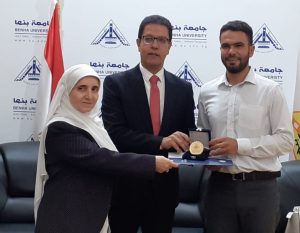 سامح عوض كرم الدكتور ناصر الجيزاوى القائم بعمل رئيس جامعة بنها الباحث بلال سالم المدرس المساعد بقسم الجيولوجيا بكلية العلوم بالجامعة وعضو فريق مركز الحفريات بجامعة المنصورة ، وذلك بحضور الدكتورة نهاد البرقي القائم بعمل عميد كلية العلوم . ووجه ا