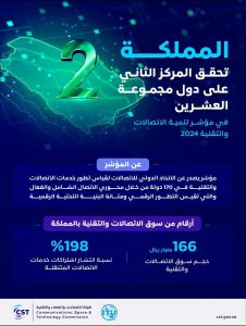 كتب /ساجدة خليل حققت المملكة المركز الثاني على دول مجموعة العشرين للمرة الثانية على التوالي، في مؤشر تنمية الاتصالات والتقنية 2024 الصادر عن الاتحاد الدولي للاتصالات، الذي يرصد اقتصادات 170 دولة لقياس التطور الرقمي وتقدم الدول في خدمات ال