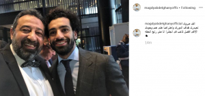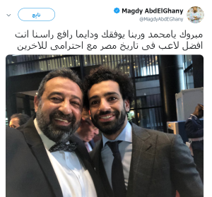 هنأ مجدى عبد الغنى، عضو مجلس إدارة اتحاد الكرة، النجم محمد صلاح، المحترف فى صفوف ليفربول الإنجليزى، بعد تصدره قائمة هدافى البريميرليج، ونشر عبد الغنى صورة له مع صلاح، صحبها بتعليق: "مبروك يامحمد وربنا يوفقك ودايما رافع راسنا، أنت أفضل لاعب فى تاريخ مصر مع احترامى للآخرين". وأض