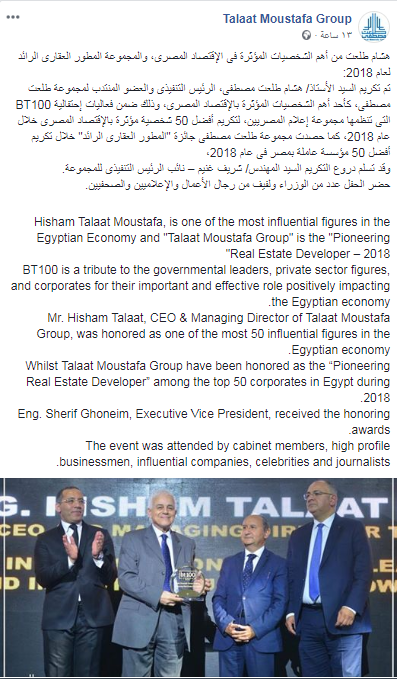 وقالت المجموعة: "تم تكريم الأستاذ هشام طلعت مصطفى، الرئيس التنفيذى والعضو المنتدب لمجموعة طلعت مصطفى، كأحد أهم الشخصيات المؤثرة بالاقتصاد المصرى، وذلك ضمن فعاليات إحتفالية BT100 التى تنظمها مجموعة إعلام المصريين، لتكريم أفضل 50 شخصية مؤثرة بالإقتصاد المصرى خلال عام 2018".