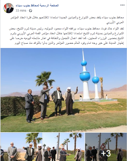 تفقد اللواء خالد فودة، محافظ جنوب سيناء، يرافقه اللواء محمود السوليه، رئيس مدينة شرم الشيخ، بعض الشوارع والميادين بمدينة شرم الشيخ استعدادا لافتتاحها خلال انعقاد مؤتمر القمة العربية الأوروبية بشرم الشيخ، برئاسة الرئيس عبد الفتاح السيسى، ودونالد توسك رئيس المجلس الأوروبى. كما ت