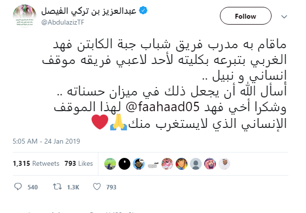 وأشاد عبد العزيز بن تركى الفيصل، رئيس الهيئة العامة للرياضة السعودية، بالموقف الإنسانى لمدرب فريق شباب جبة.