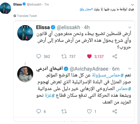 هاجمت الفنانة اللبنانية الشهيرة إليسا، أفيخاى أدرعى، المتحدث الرسمى باسم قوات الاحتلال الاسرائيلية، بعدما رد على تغريدة لها، وقال أن حماس هى المسئولة عن هذا الوضع المؤلم، مؤكدا أنها تدفع قطاع غزة نحو مزيد من العنف، وهو ما دعا إليسا، فى وضعه فى القائمة المحظورة لديها. وكانت إلي