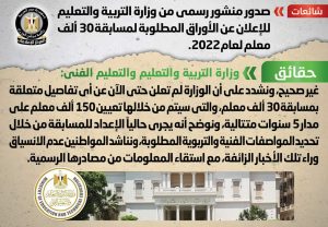 انتشر في بعض المواقع الإلكترونية وصفحات التواصل الاجتماعي أنباء بشأن صدور منشور رسمي من وزارة التربية والتعليم للإعلان عن الأوراق المطلوبة لمسابقة ٣٠ ألف معلم لعام ٢٠٢٢، وقد قام المركز الإعلامي لمجلس الوزراء بالتواصل مع وزارة التربية والتعليم والتعليم الفني، والتي نفت تلك الأنباء، مُؤكدةً أنه لا صحة لصدور أي منشور رسمي من الوزارة للإعلان عن الأوراق المطلوبة لمسابقة ٣٠ ألف معلم لعام ٢٠٢٢