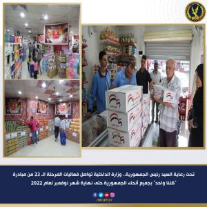 فى إطار توجيهات القيادة السياسية لإتخاذ كافة الإجراءات اللازمة لدعم منظومة الحماية الإجتماعية للمواطنين.. وزارة الداخلية تواصل فعاليات المرحلة الثالثة والعشرين من مبادرة ( كلنا واحد) تحت رعاية السيد/ رئيس الجمهورية التى من المقرر أن تستمر حتى نهاية شهر نوفمبر لعام 2022..