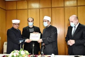 وفي ختام الحفل كرَّم معالي أ.د/ محمد مختار جمعة وزير الأوقاف ، ومعالي الشيخ/ حاتم محمد حلمي وزير الأوقاف والشئون الدينية الفلسطيني ، ومعالي الدكتور/ محمود صدقي الهباش مستشار الرئيس الفلسطيني للشئون الدينية وقاضي قضاة فلسطين الأئمة من مصر وفلسطين المشاركين في الدورة التدريبية المشتركة ، وتم منحهم شهادة حضور الدورة.