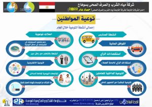 وفى مجال نشر الوعى المائي، تم تنفيذ أكثر من 500 نشاط توعوى استهدف أكثر من 100 ألف مواطن من خلال تنفيذ ندوات توعوية لرجال الدين الإسلامي والمسيحي وقادة الرأي بالقرى، وكذلك تنفيذ قوافل مائية للمواطنين في جميع قرى ونجوع المحافظة ورحلات تعريفية لمحطات مياه الشرب والصرف الصحي، وكذلك أنشطة توعوية لطلاب المدارس واستطلاعات رأي المواطنين حول خدمات مياه الشرب والصرف الصحي وورش سباكة للسيدات لتعليمهم كيفية إصلاح الأدوات المنزلية وحملات لتوعية المواطنين حيث تشمل هذه الأنشطة عدة رسائل اتصالية، منها أهمية ترشيد استهلاك المياه والحفاظ على شبكات الصرف الصحي، وأضرار القيسونات على الخزان الجوفي ومخاطر الطلمبات الحبشية والفلاتر على الصحة العامة، وأهمية دفع الفواتير لاستمرار قيام الشركة في تأدية مهامها.