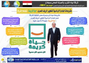 وقال: شاركت الشركة في الإشراف على مشروعات مياه الشرب والصرف الصحى التى يتم تنفيذها فى 7 مراكز بسوهاج ضمن المبادرة الرئاسية لتطوير الريف المصرى " حياة كريمة " بقيمة 26.8 مليار جنيه، من خلال اعتماد التصميمات والمشاركة في أعمال الإشراف، والتى تنفذها الهيئة الهندسية للقوات المسلحة ، وأن هذه المشروعات تشمل 8 محطات معالجة صرف صحى، وخطوط طرد ومحطات رفع وشبكات انحدار و 3 محطات مياه شرب سطحية وخطوط ناقلة وشبكات مياه ووحدات إزالة الحديد والمنجنيز، لخدمة حوالي 3.3 مليون نسمة.