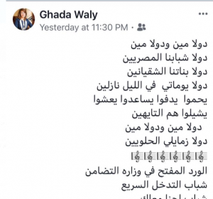 نشرت الدكتورة غادة والى عبر حسابها الشخصى على "فيس بوك" للاحتفاء بنشاط حملة "شباب التدخل السريع"، حيث كتبت: "دولا مين ودولا مين.. دولا شبابنا المصريين.. دولا بناتنا الشقيانين.. دولا يوماتى فى الليل نازلين.. يحموا يدفوا يساعدوا يعشوا.. يشيلوا هم التايهين.. دولا مين ودولا مين.. دول